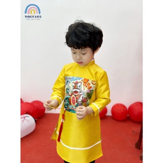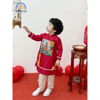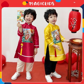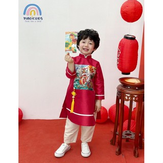 Áo dài Tết cho bé trai 2 3 4 5 6 7 8 9 10 tuổi mẫu 2024 Magickids in Lân chất taffa kèm dây treo Quần áo trẻ em AD22007