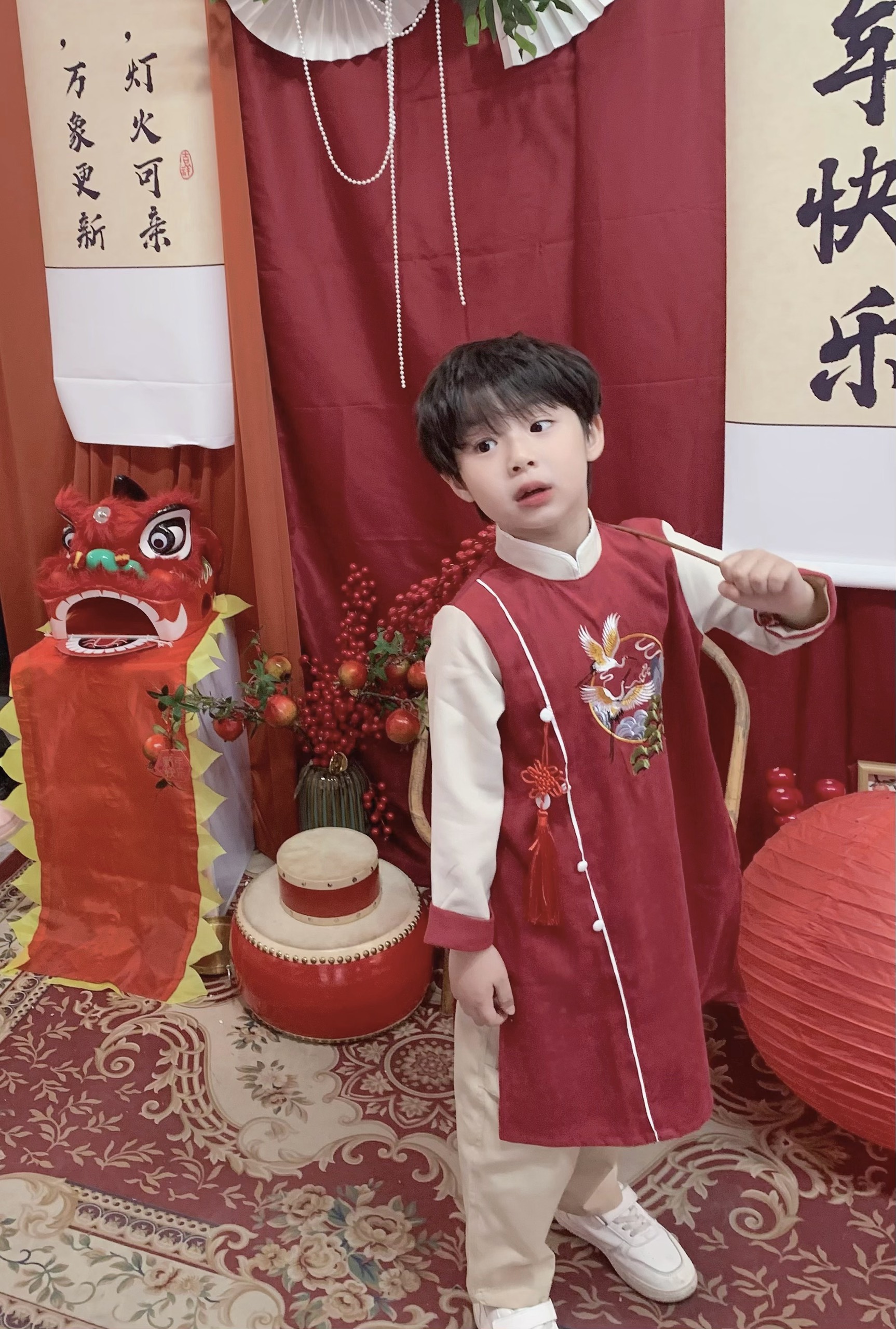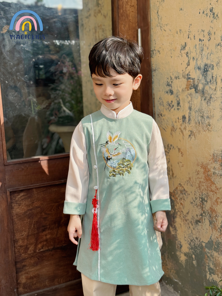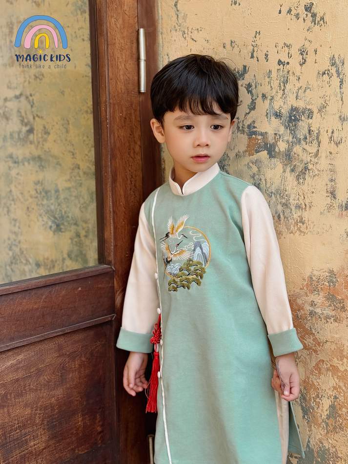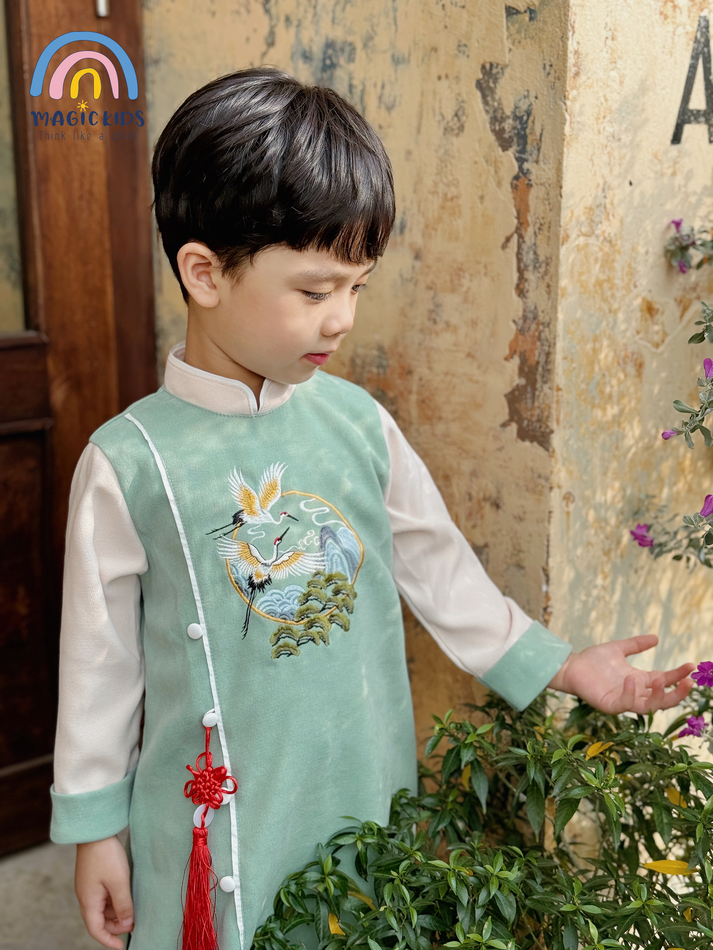 - Tên sản phẩm :Áo dài Tết cho bé trai size đại 40kg Magickids áo dài cổ truyền chất text nhung thêu hạc tặng kèm dây khánh AD23020